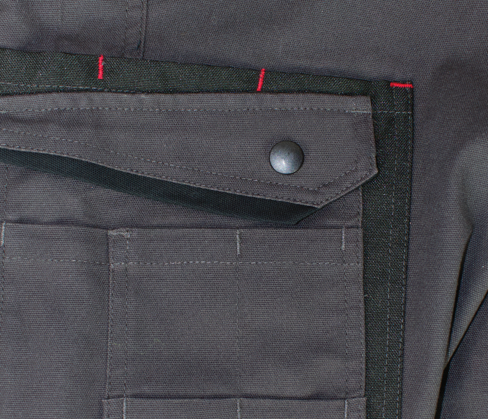 - 2 džepa koljena s otvorom na dnu za jastučiće za koljena i zatvaranje čičkom. Džepovi su ojačani poliesterskom Oxford 600D tkaninom, koju karakterizira visoka izdržljivost, otpornost na abraziju i istezanje, kao i otpornost na vodu